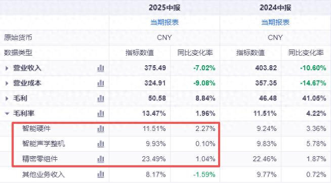 例如歌尔精密零组件业务的亮眼表现。AI人工智能技术在端侧设备的落地,催生了市场对高性能声学传感器、微型扬声器等产品的需求。歌尔以业内领先的精密制造能力,保障了产品的技术壁垒和高附加值,从而推动了该业务的毛利率维持在高位。产品有市场、有价值,企业就会有回报。2025年上半年,歌尔精密零组件业务的营收同比增长了20.54%,正是最好的侧写。